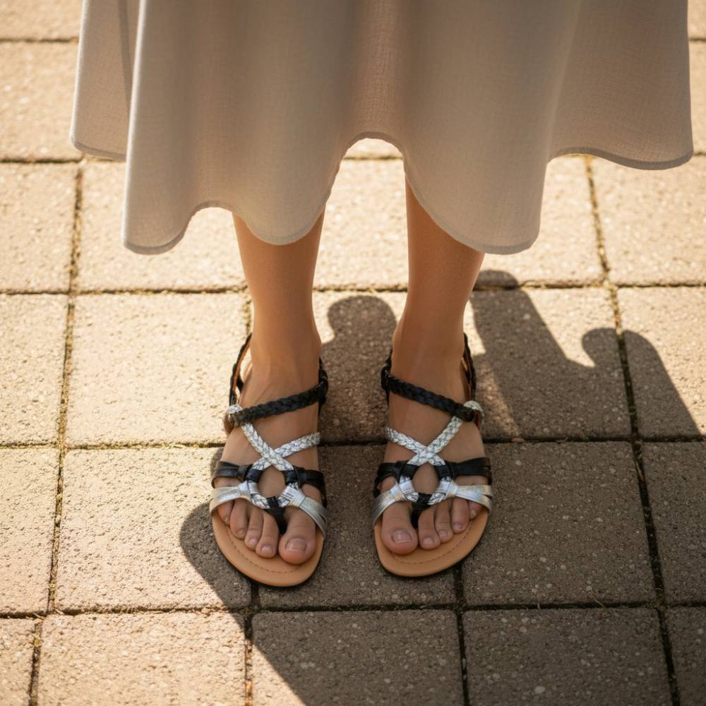 Stropperne i sort og sølv løber i usædvanlig form, undertiden flettet, undertiden knyttet. Dette udgør det feminine udseende af de barfodede sandaler. Og bedst af alt: Du behøver ikke at åbne noget for at glide ind, fordi vi har indarbejdet et elastisk bånd på bagsiden af stroppen. Det er lettere at tage på og tage en sandal af.