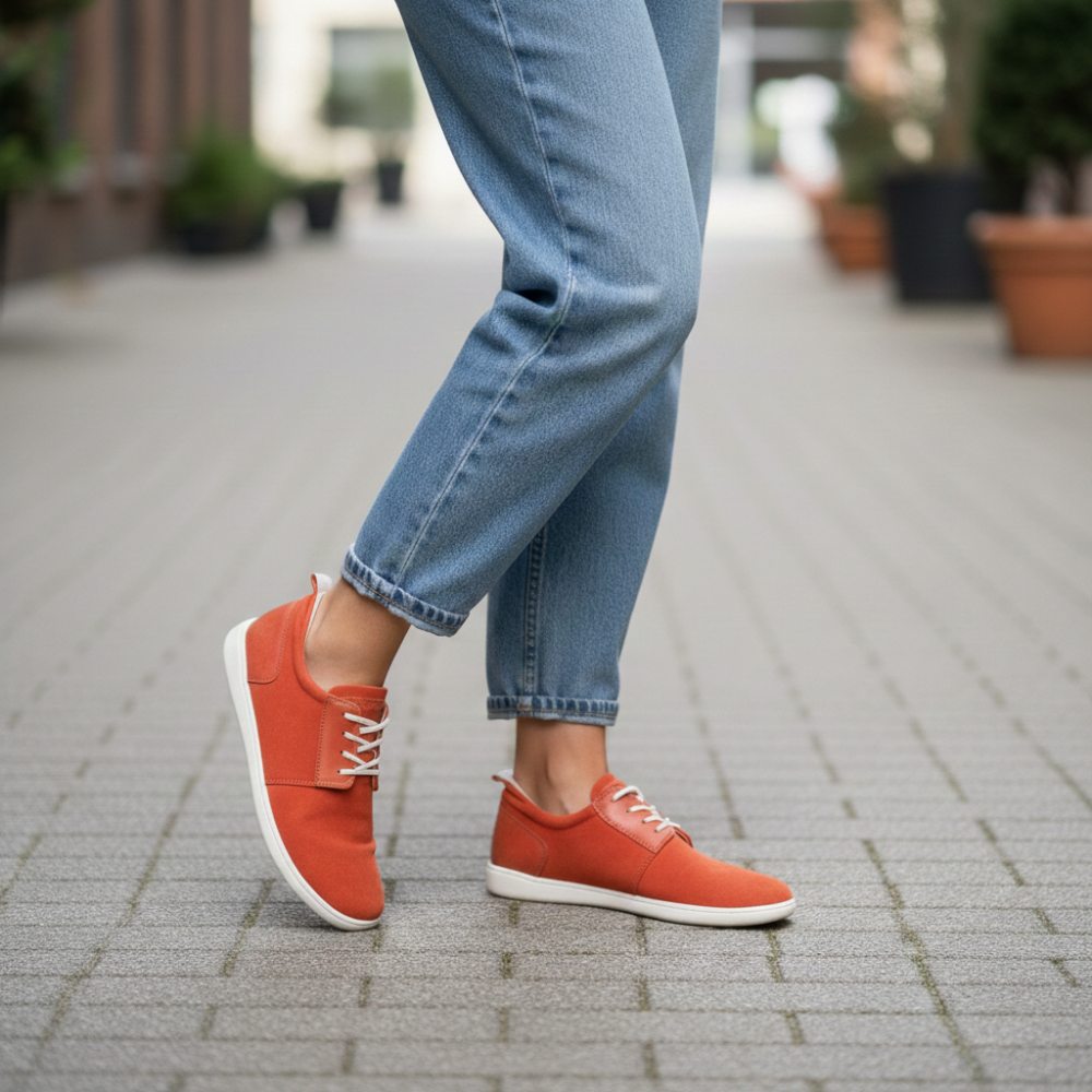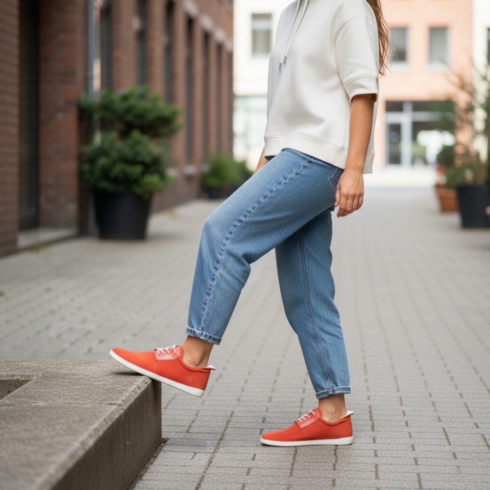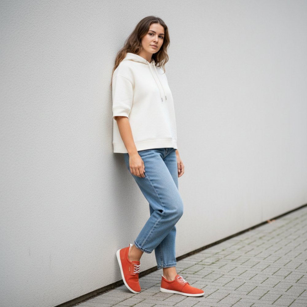 Alt om den barfodede sko er lavet af materialer med høj kvalitet og er selvfølgelig hånd syet. Med den hvide farve tilbyder den tynde og meget fleksible sål en dejlig kontrast til den slående orange tone. Den barfodede sko ser frisk og moderne ud og krydderer hvert tøj. Han ser bare uimodståelig ud for jeans og tiltrækker sig selv opmærksomheden. Det er ikke mere pikant end i udførelsen af opal!