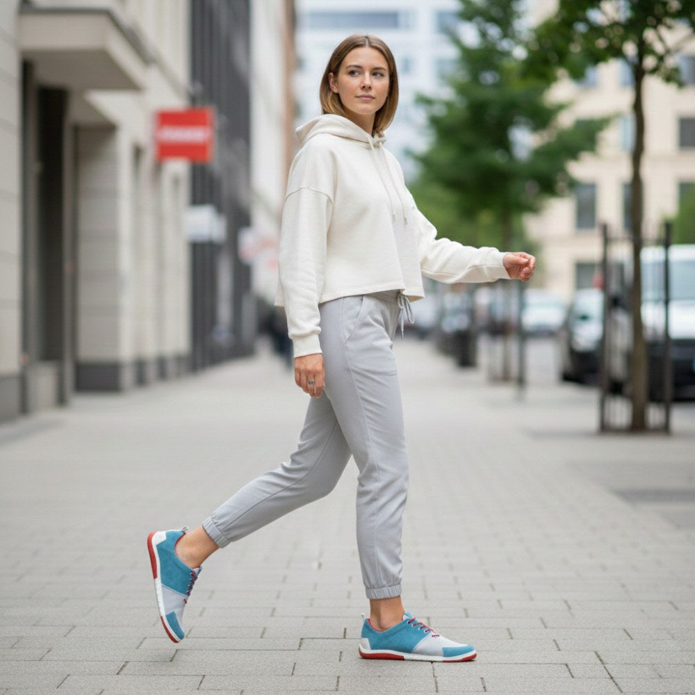 Den lyseblå, parret med røde snørebånd, der ikke kun tjener som en iøjnefaldende, men også muliggør en sikker snøring, og de lysegrå indsatser, gør denne barfodede sneaker til en rigtig iøjnefaldende!
