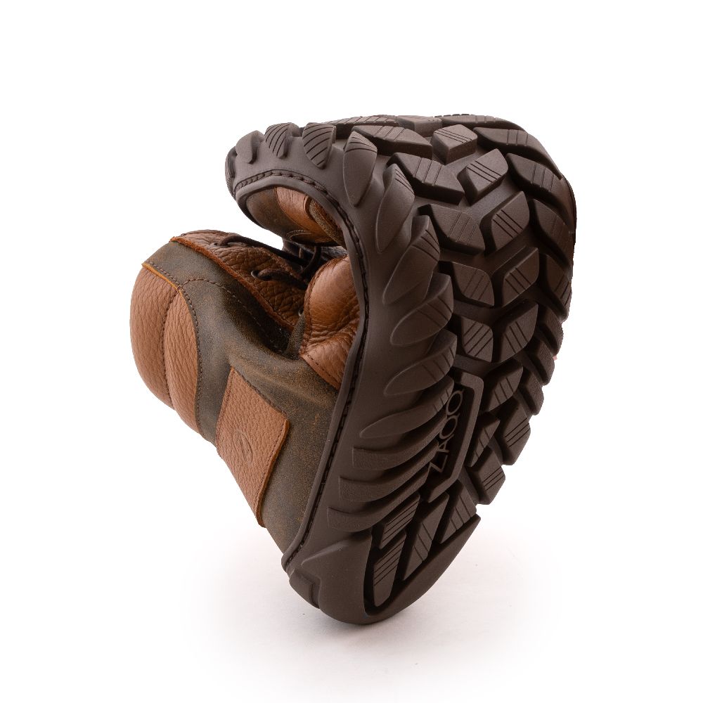 QOBAN Brown ist der Herrenschuh, der Robustheit und pures Barfußgefühl verbindet. Der markante Ledermix in warmen Brauntönen wirkt maskulin und hochwertig und die schnörkellose Mid-Cut-Silhouette sitzt leicht am Fuß.