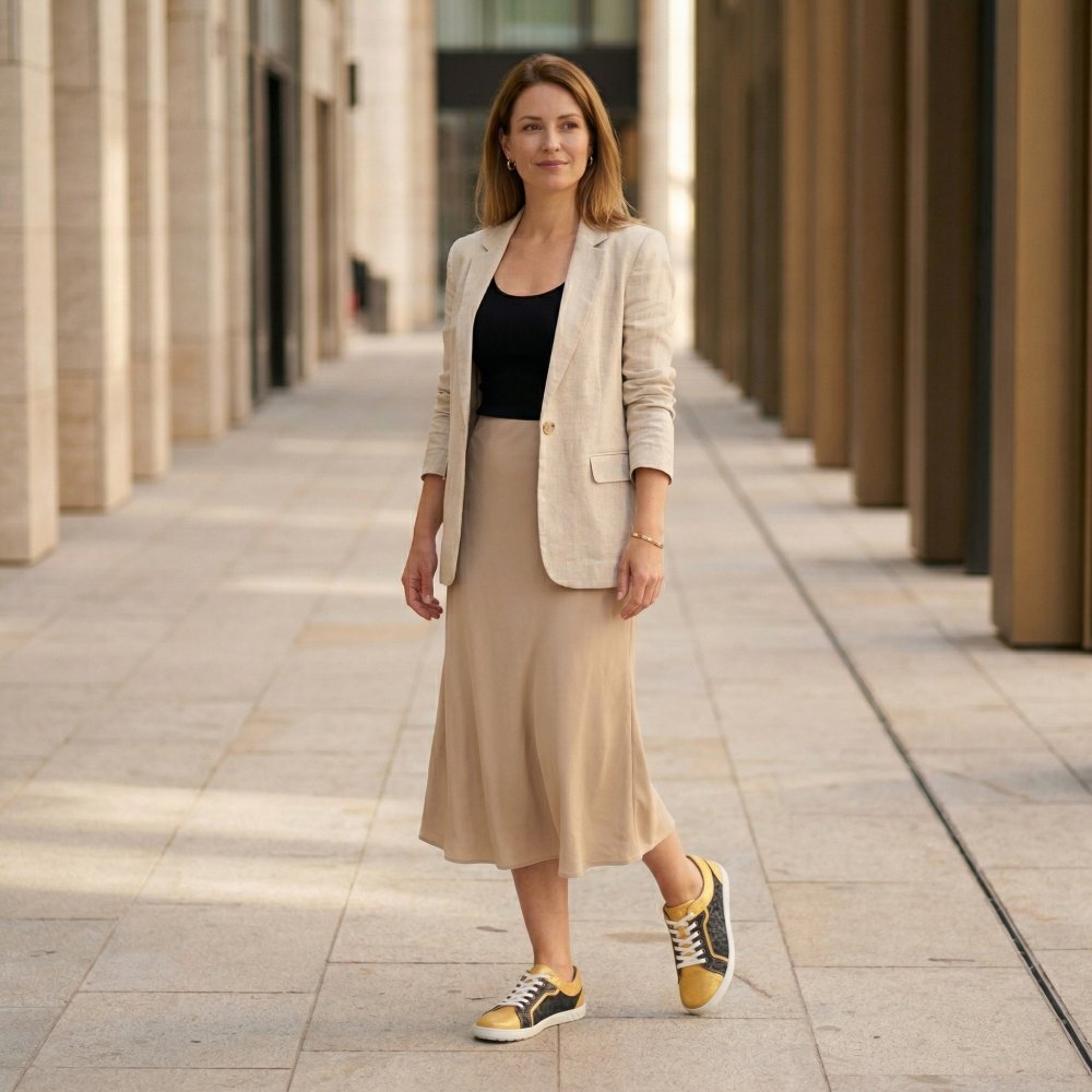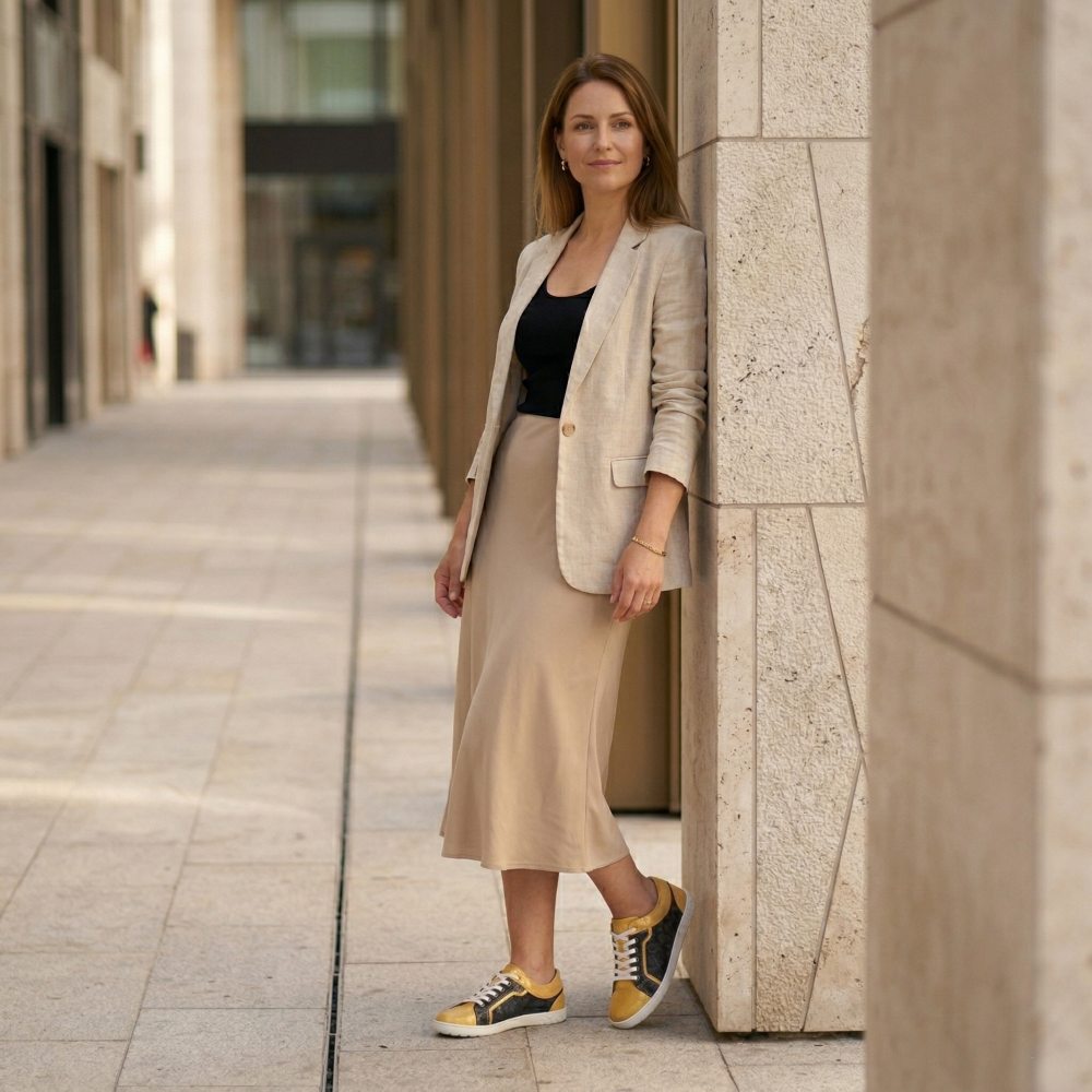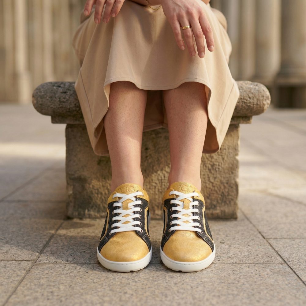 Qody Gold er din nye glamorøse sneaker, som er særlig feminin. Med denne barfodede sko er du garanteret at trække mange interesserede blik på dig selv.