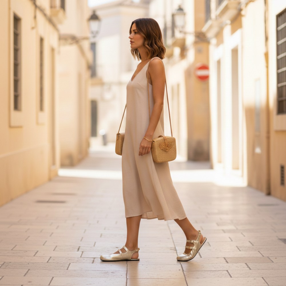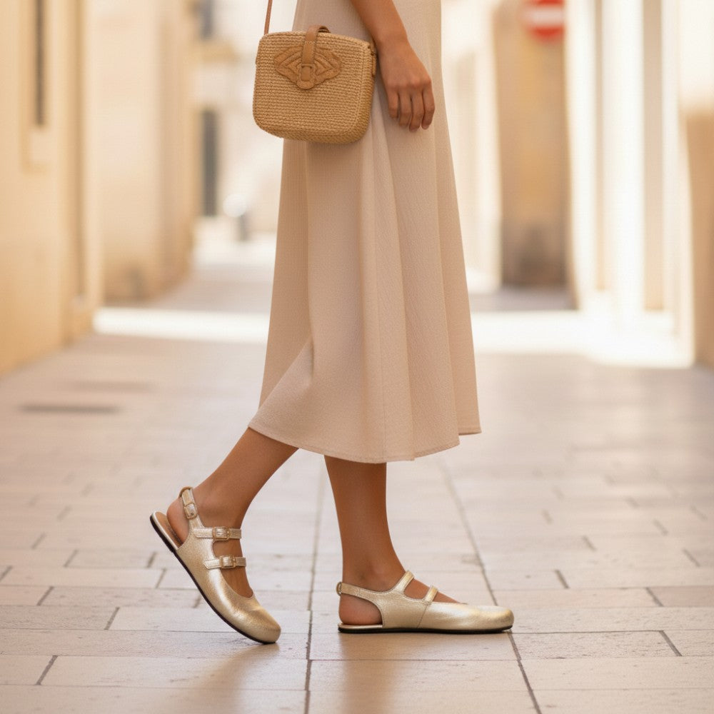 Den fleksible sål og den bløde glans læder tilpasser sig dine bevægelser. Vær aktiv hele dagen uden foregående stil - vores Qomeet Gold gør det muligt. Bær den til din yndlings sommerkjole, eller kombiner den med flydende bukser og en elegant top til et elegant aftenudseende. Qomeet-guldet giver også dit tøj et strejf af glamour til jeans og en simpel t-shirt. Det er den ideelle ledsager til bryllupper, havefester eller bare for en dag på kontoret, hvis du vil give dit look en særlig accent.
