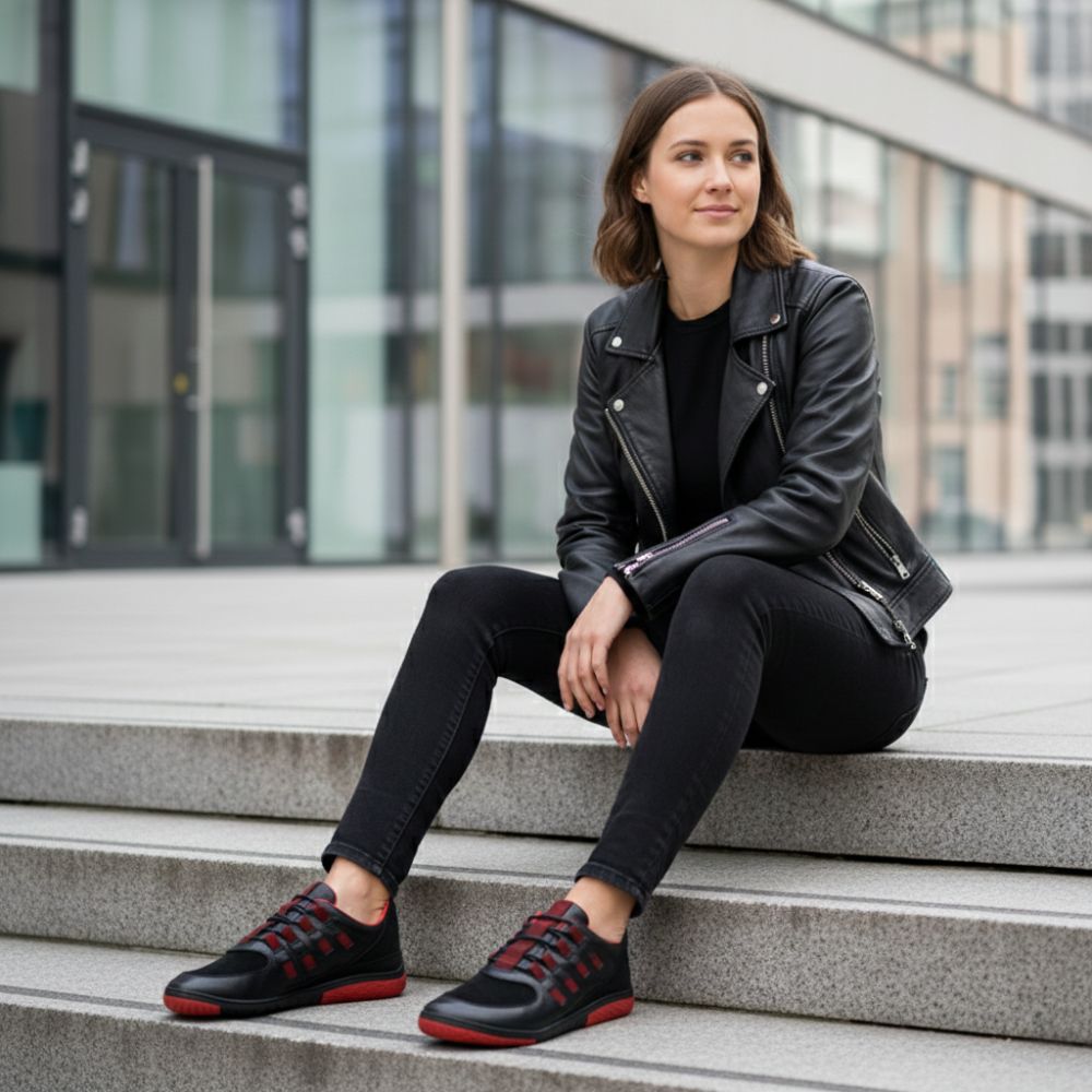 Det sorte og røde farvekoncept løber igennem til sålen og passer således perfekt med det smarte look på den barfodede sneaker. Men ikke kun designet til vores nye ZAQQ Minimal entusiastisk, den løbende følelse vil også sprænge dig rundt! Det giver dig en uforlignelig følelse af barfodet.